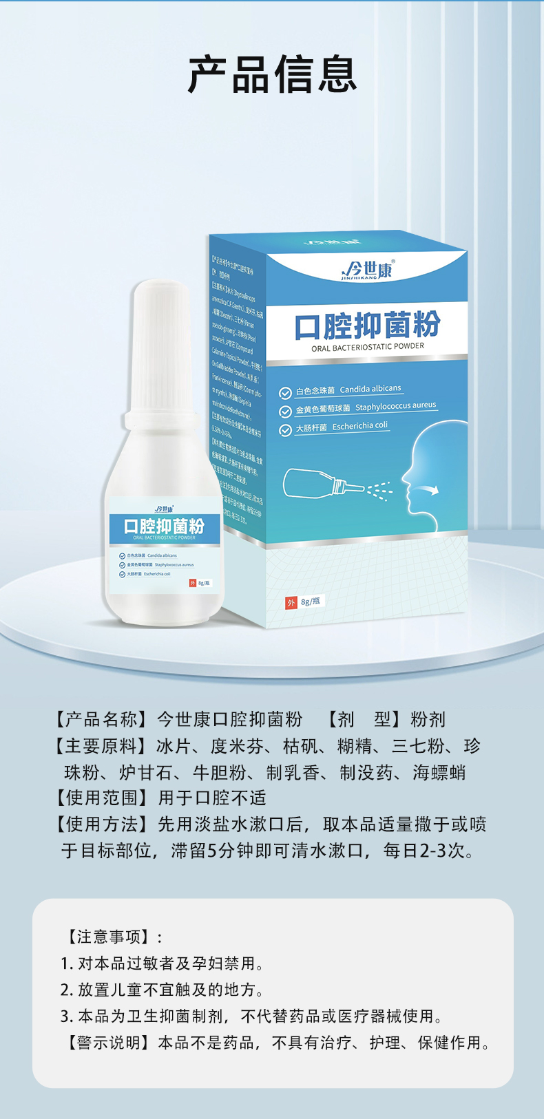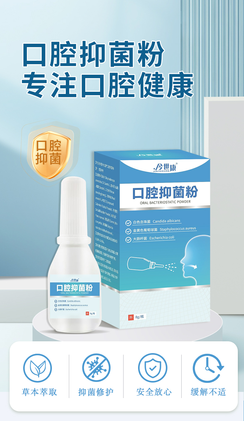 口腔抑菌粉,是今世康廠家專為口腔健康研制,草本萃取,安全不刺激,使用方法先用淡鹽水漱口后,取本品適量撒于或噴于目標(biāo)部位,滯留5分鐘即可清水漱口,每日2-3次,抑菌粉生產(chǎn)廠家,支持不同材質(zhì)、規(guī)格、形狀、包裝設(shè)計(jì),滿足多種渠道需求的粉劑、貼劑、膏劑、液體等一站式oem貼牌加工定制服務(wù)。