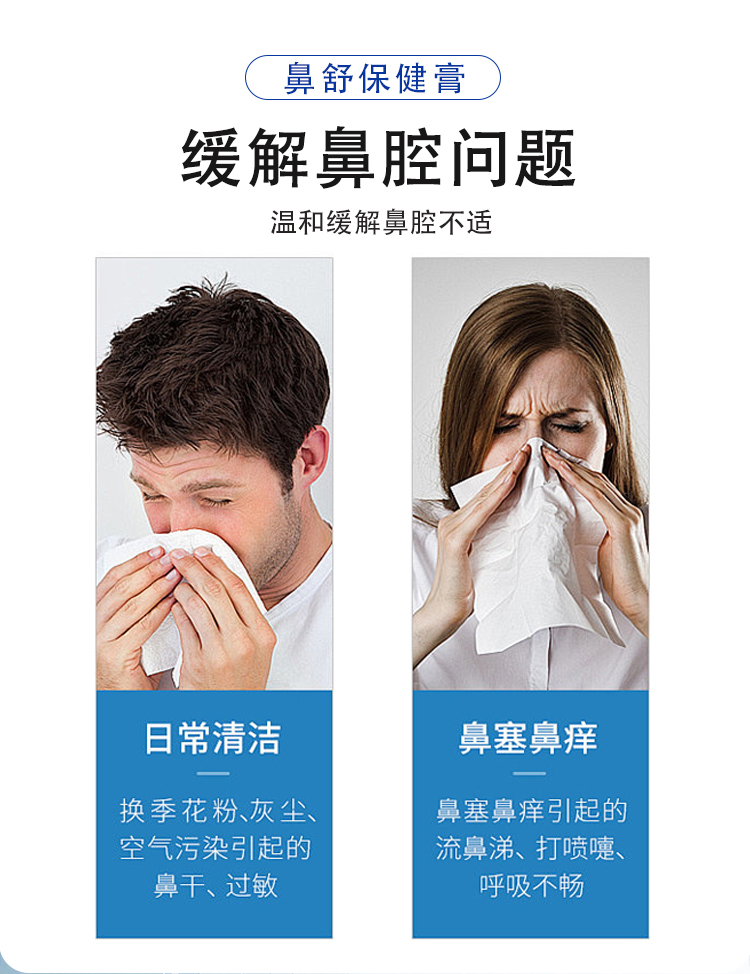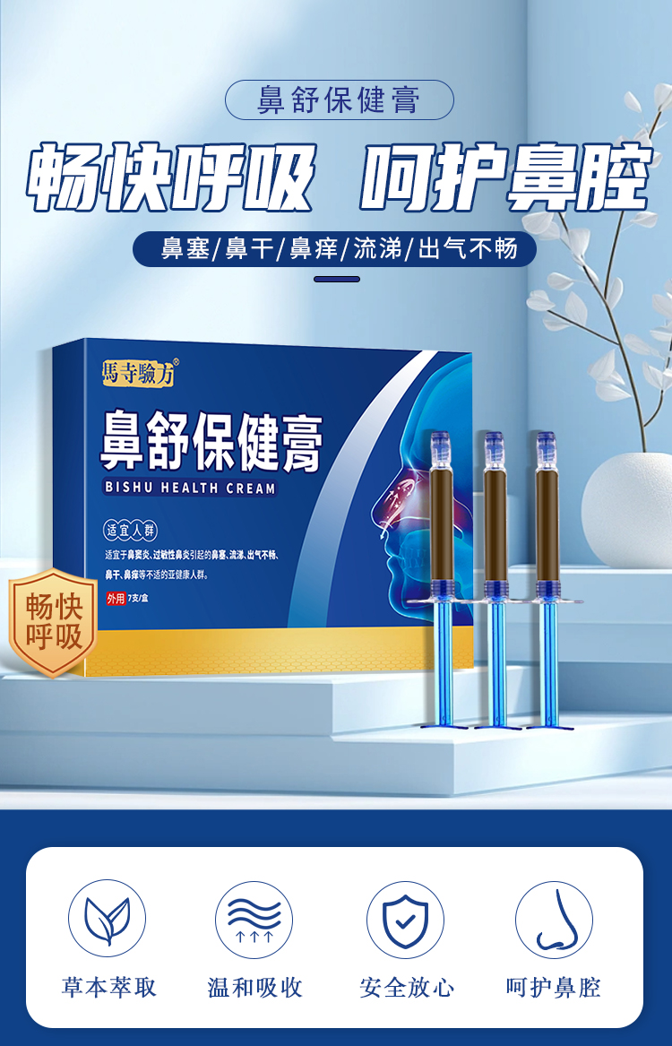 鼻舒保健膏,以草本成分為主的鼻腔護理產(chǎn)品,適用于鼻塞、鼻干、鼻癢、流涕、出氣不暢等鼻部不適,規(guī)格為7支/盒,將管頭保險蓋拔掉,對準鼻腔,慢慢推入鼻內(nèi),每天建議使用1次,源頭廠家,多樣化oem貼牌代加工。