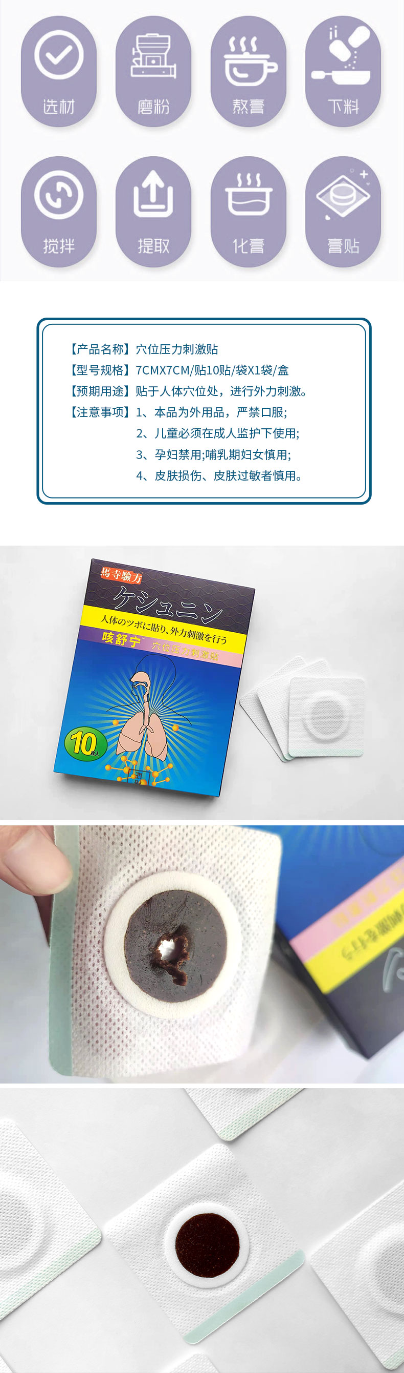 馬寺驗(yàn)方咳舒寧穴位貼,萃取草本,蜂蜜基質(zhì)溫和吸收,數(shù)道穴位貼加工工序,無(wú)紡布背襯穴位敷貼透氣親膚,貼敷方便,小巧便攜,持續(xù)溫護(hù)24小時(shí),正規(guī)工廠,標(biāo)準(zhǔn)化生產(chǎn)車(chē)間,多樣化定制,出貨快,承接貼牌代加工,支持批發(fā)代理,量大從優(yōu)。